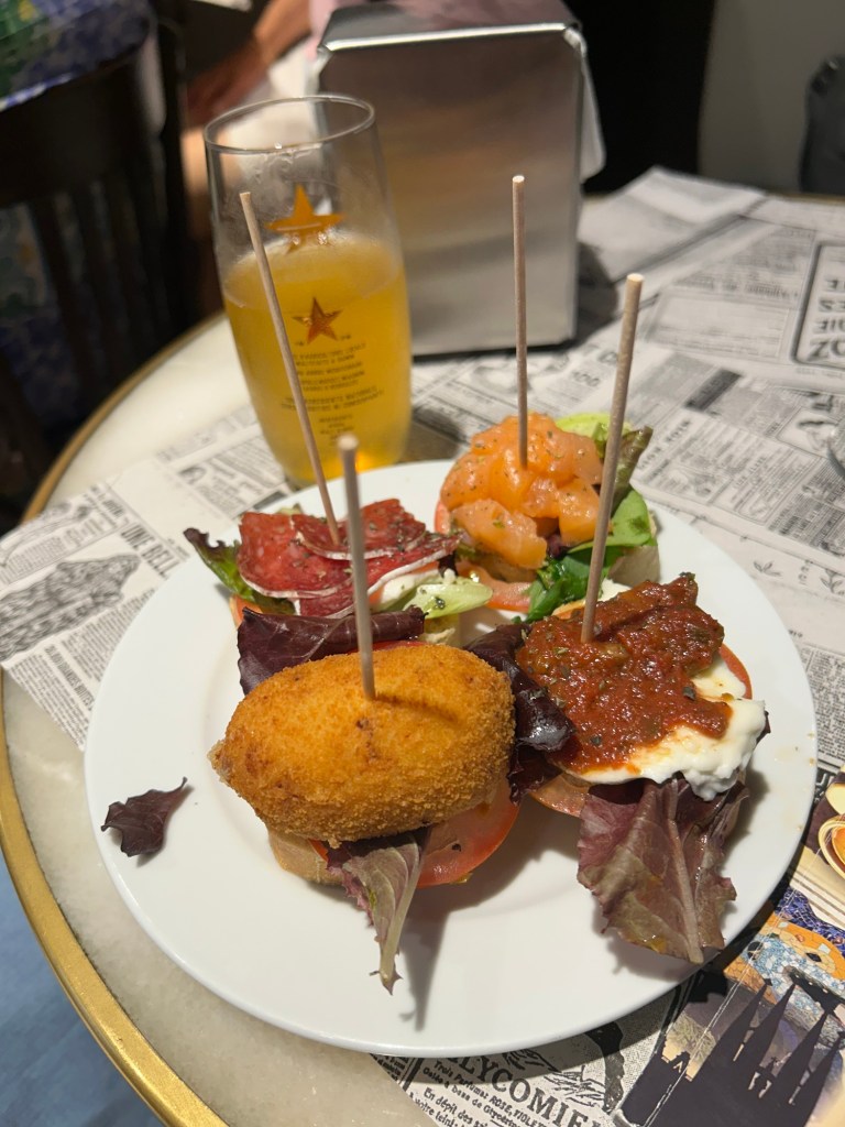 We were quite hungry at that point and Irene took us to eat some “pinchos” which are traditional small bites – different than tapas. Pinchos are all served on a slice of bread and are combinations of meats, cheeses, veggies and other deliciousness. They hit the spot. After that, we strolled through the gothic quarter for a bit on our way to the famous street Las Ramblas (which was a bit disappointing this time around as previously it was full of street performers and people dressed in amazing costumes but apparently that’s been banned). At the top of Las Ramblas we stepped into Nuria for some traditional tapas – patatas bravas, Iberico ham, toasted bread with tomato’s and olive oil, etc. It was muy bien! And that was the day as we had to be back on board before 5. It was a whirlwind tour of Barcelona, one of my favorite cities to visit.